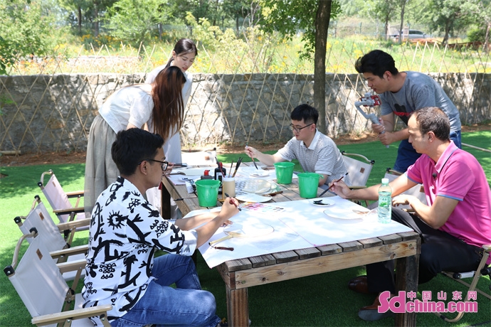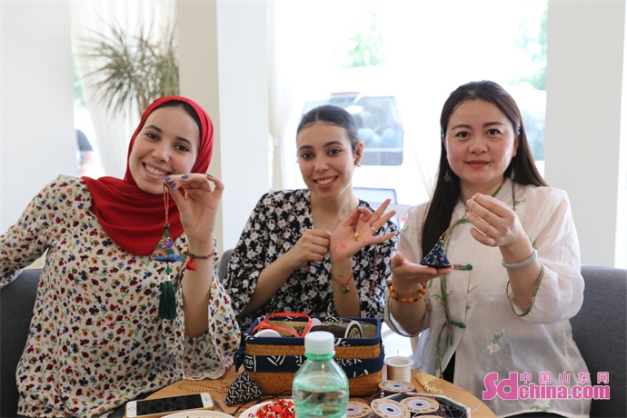 A group of six international students and foreign teachers visited Yangxuantang Tea Culture Park in Qiling Sub-district, Linzi District, where they made sachets, wove colorful ropes, and tasted tea... appreciating the charm of traditional culture.