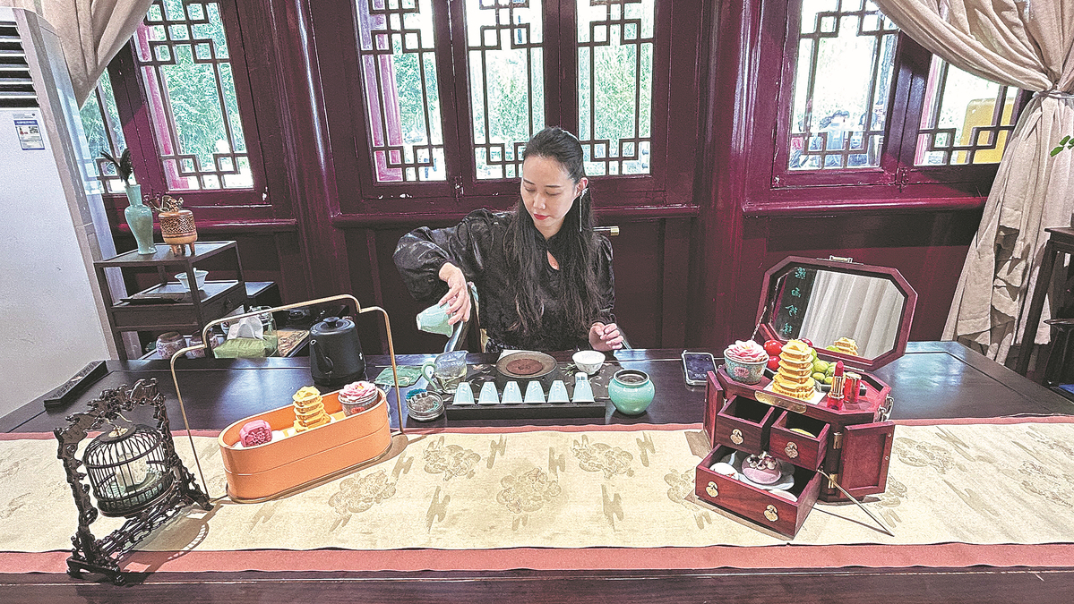 Wang Ying, an operator of the Nanfeng Theater in Jinan, Shandong province, prepares traditional Chinese afternoon tea for visitors on Sept 10. LIU CHUAN/FOR CHINA DAILY